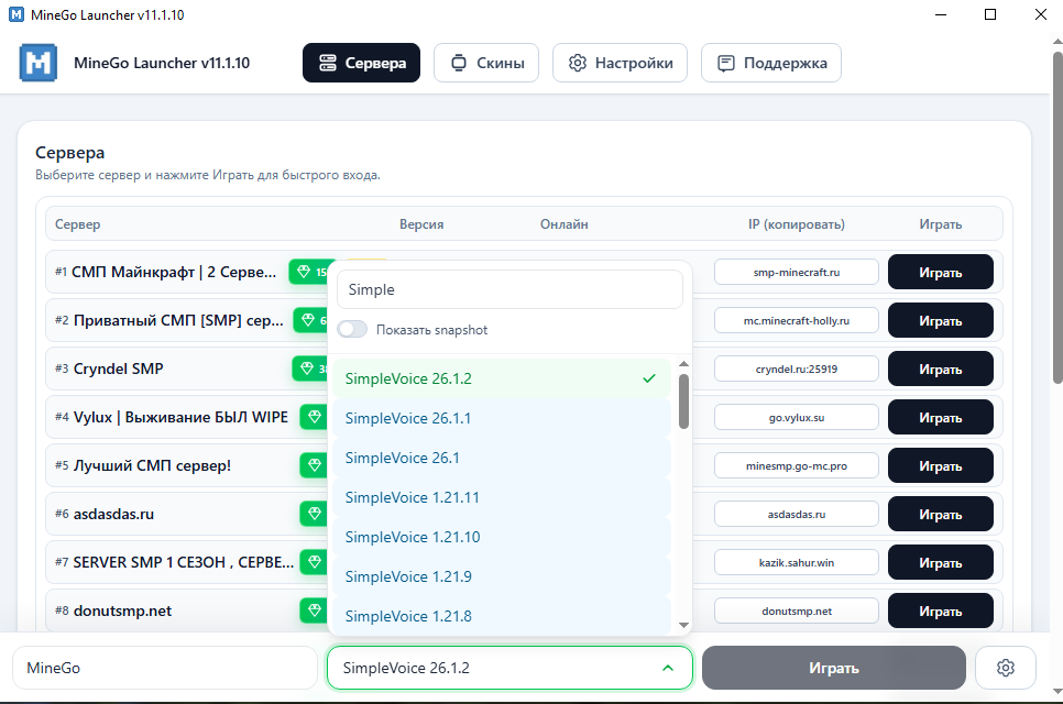 Раздел сделан для удобства: здесь проще найти нужную версию SimpleVoice и установить всё через свежий лаунчер MineGo без ручной работы.